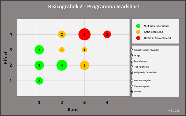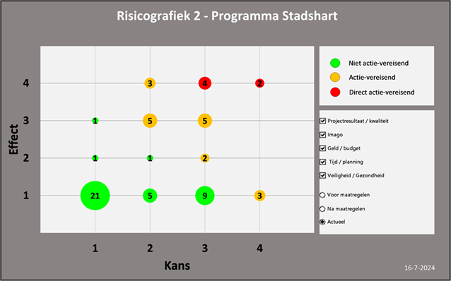 In de beschrijving hierboven zijn bij een aantal projecten in uitvoering al risico’s en beheersmaatregelen beschreven. Op het niveau van programma Stadshart analyseren we ook risico’s. Hieronder de belangrijkste, alsmede de risicografieken die een beeld geven van de verschuivingen ten opzichte van de vorige voortgangsrapportage.