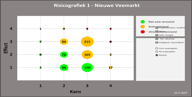 Het plan (ROP) voor de Nieuwe Veemarkt omvat een aantal ambities die mede afhankelijk zijn van samenwerking en/of andere partijen en initiatiefnemers, zoals bijvoorbeeld de ambitie om de bestaande supermarkt op een andere locatie in de Nieuwe Veemarkt te faciliteren. Ook is er voor sommige ambities een afhankelijkheid van een grotere keuze (stadsbreed), bijvoorbeeld op het gebied van mobiliteit. Het risico bestaat dat deze ambities of eisen in de verdere planuitwerking niet realistisch en/of haalbaar zijn of een financieel (negatief) effect op de grondexploitatie (hogere kosten of lagere opbrengsten).