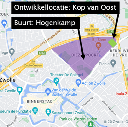 Sinds medio 2022 werken de gemeente Zwolle en SWZ samen aan de ontwikkeling van de Kop van Oost. De Kop van Oost betreft een herstructurering van een gebied in de Kop van Dieze Oost (zie figuur 1). Dit betreft de locatie gelegen tussen de Caspar Fagelstraat en de Antonie Heinsiusstraat. In dit woningen-kwadrant staan 88 portiek etagewoningen (sociale huur) verdeeld over 4 woonblokken. SWZ zet, in de nieuwbouw, in op differentiatie in woonprogramma en trekt daarom momenteel samen op met BPD in de voorbereiding van deze herontwikkeling. Er komen ca. 210 woningen terug op deze locatie.