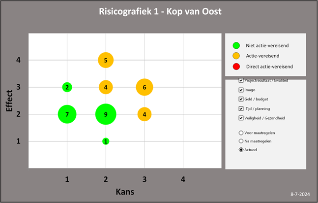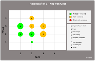 Een aantal riscio’s zijn in kans afgenomen doordat de beheersmaatregelen uitgevoerd zijn, de plannen verder uitgewerkt zijn of er afspraken zijn gemaakt op de inhoud van het plan. Tegelijkertijd zien we met de verdere uitwerking van het Ruimtelijk Ontwikkelplan ook een aantal nieuwe inhoudelijke risico’s.