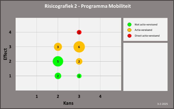 In bovenstaande bollengrafiek komt het risicoprofiel van het totale programma tot uitdrukking. Dit is de eerste Voortgangsrapportage die gemaakt wordt voor Mobiliteit. We kunnen de bollengrafiek met peildatum 1 januari 2025 dus niet vergelijken met de risico’s ten aanzien van de vorige rapportage.